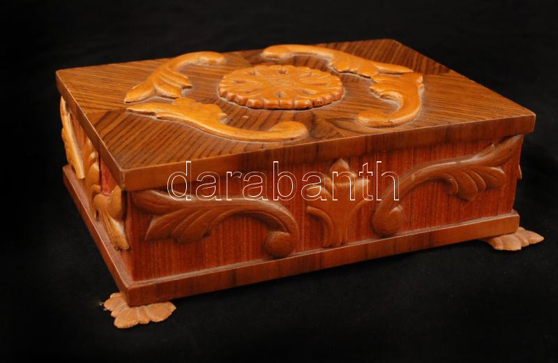 Faragott elemekkel díszített fa doboz, 16x22x8 cm