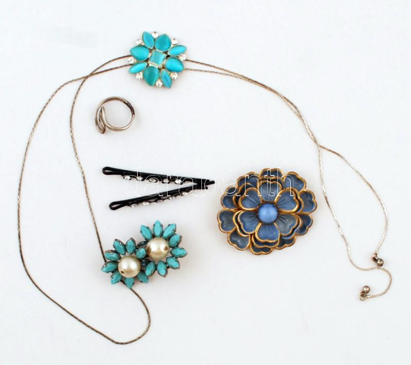 Kis bizsu tétel 2 db brossal, 2 db kis virágokkal díszített hullámcsattal, 1 db nyaklánccal, kis gyűrűvel