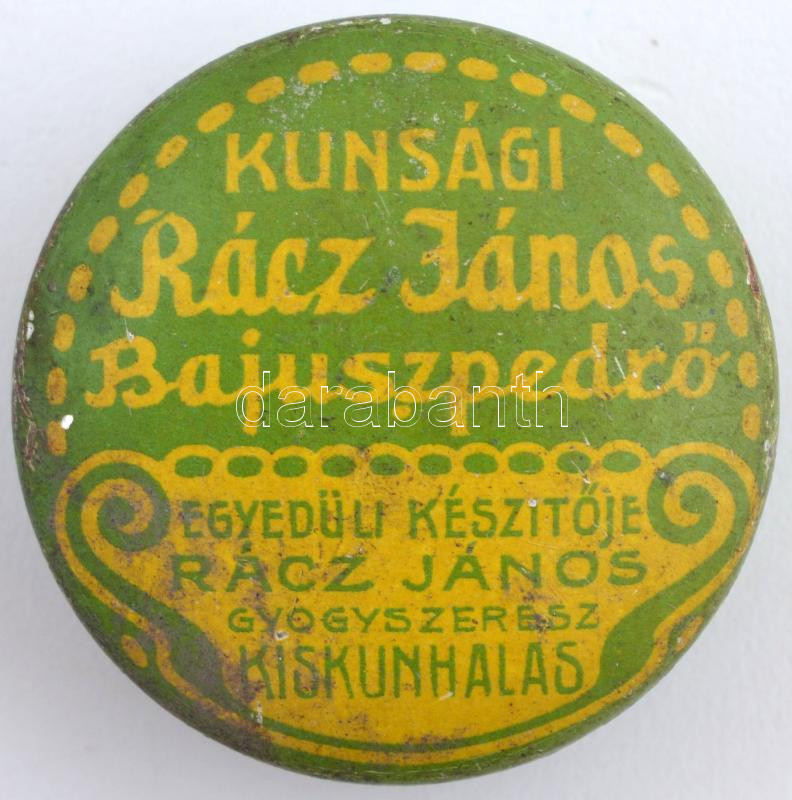 https://www.darabanth.com/en/253-Online-auction/253.0/Other-collectibles/Flea-Market~400021/Regi-gyogyszeres-fem-dobozka--Racz-Janos-Bajuszpedro-felirattal-d-3-cm~II1223313