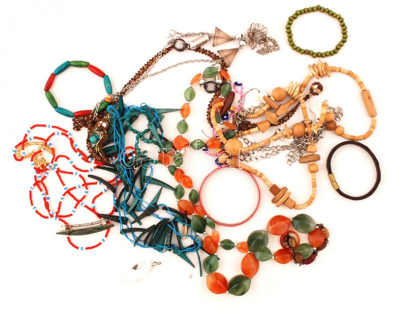 Vegyes bizsu tétel, sok karkötővel, nyaklánccal, fülbevalóval, gyűrűvel, főként gyöngyből, 18 db