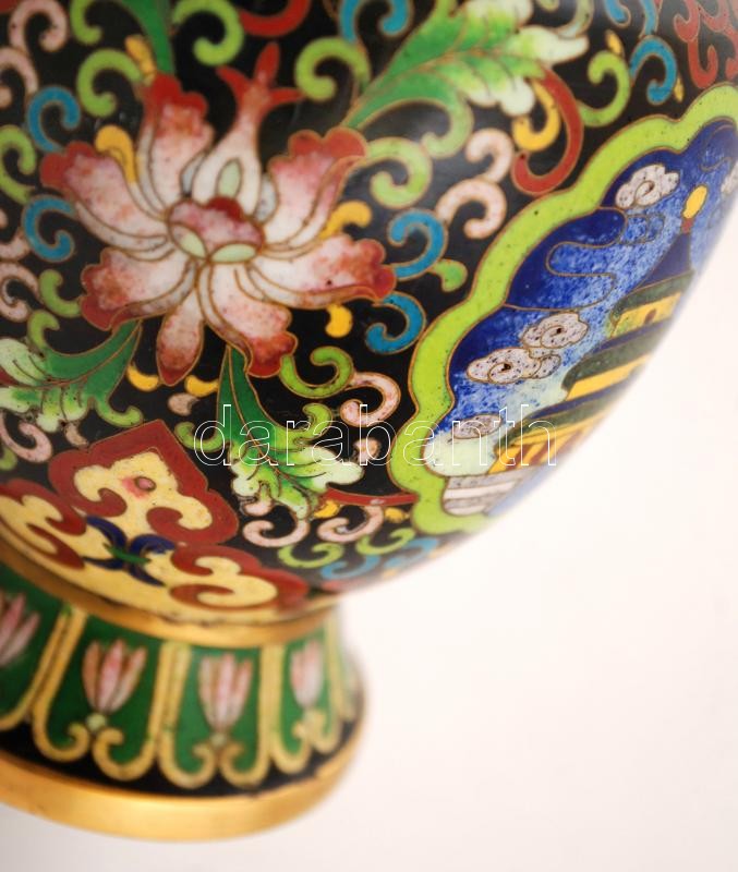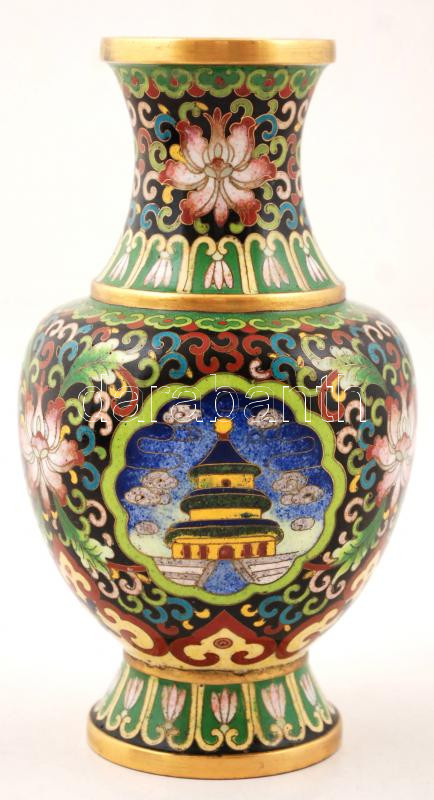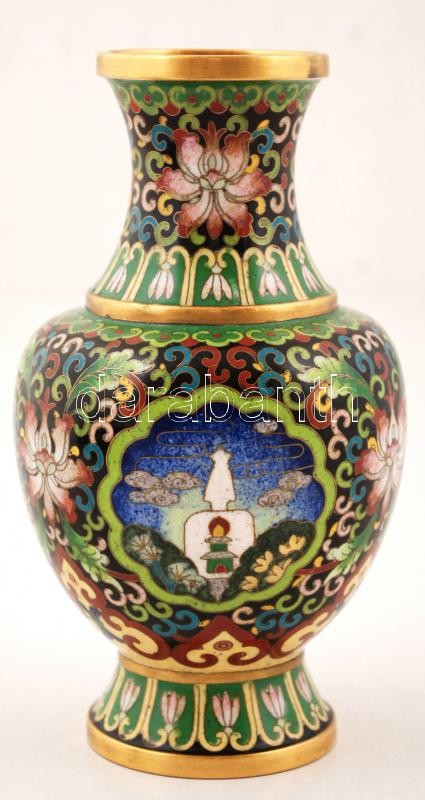 Virágokkal gazdagon díszített rekeszzománc réz váza, m: 19 cm