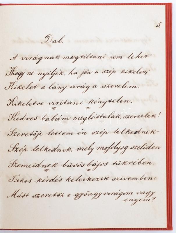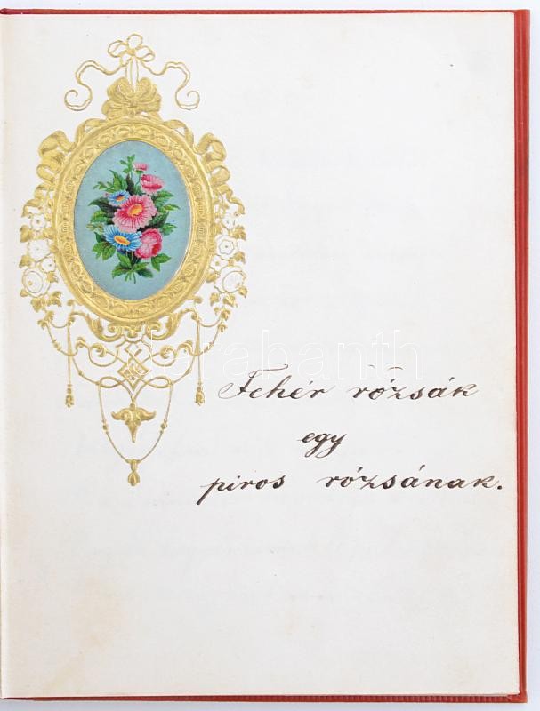 1863 Fehér rózsák egy piros Rózsának a magyar romantika szerelmes verseinek gyűjteménye díszes személyre szóló kötetben "J. J.nak Sz. B. 1863" felirattal, cca 144 beírt oldal, 13x10cm