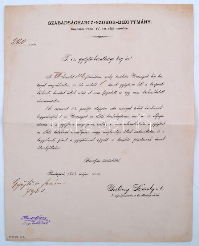 1883 Gerlóczy Károly (1835-1900) budapesti alpolgármester nyomtatott levele a szabadságharc-szobor bizottmány ügyében, kéziratos rajta feljegyzésekkel