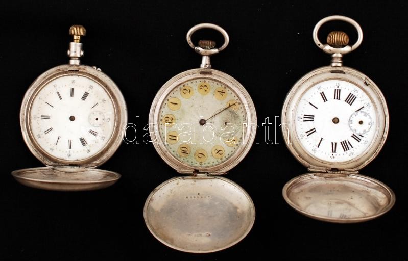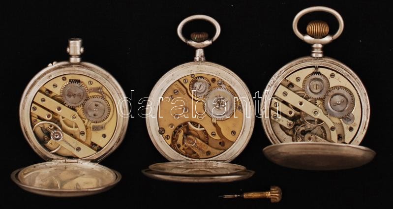 3 db ezüst (Ag.) zsebóra, jelzettek, nem működnek, hiányosak, bruttó 249 g