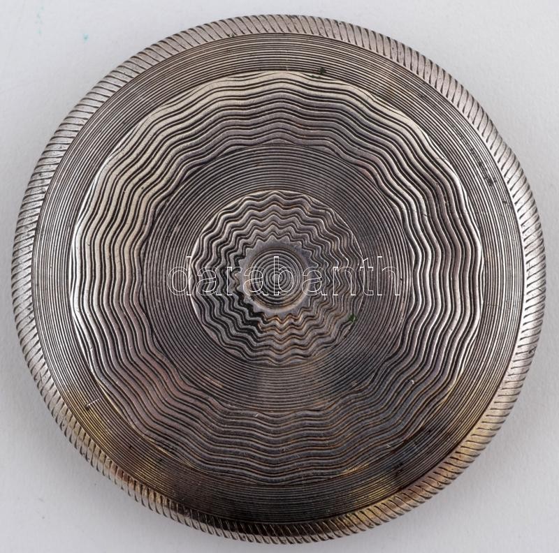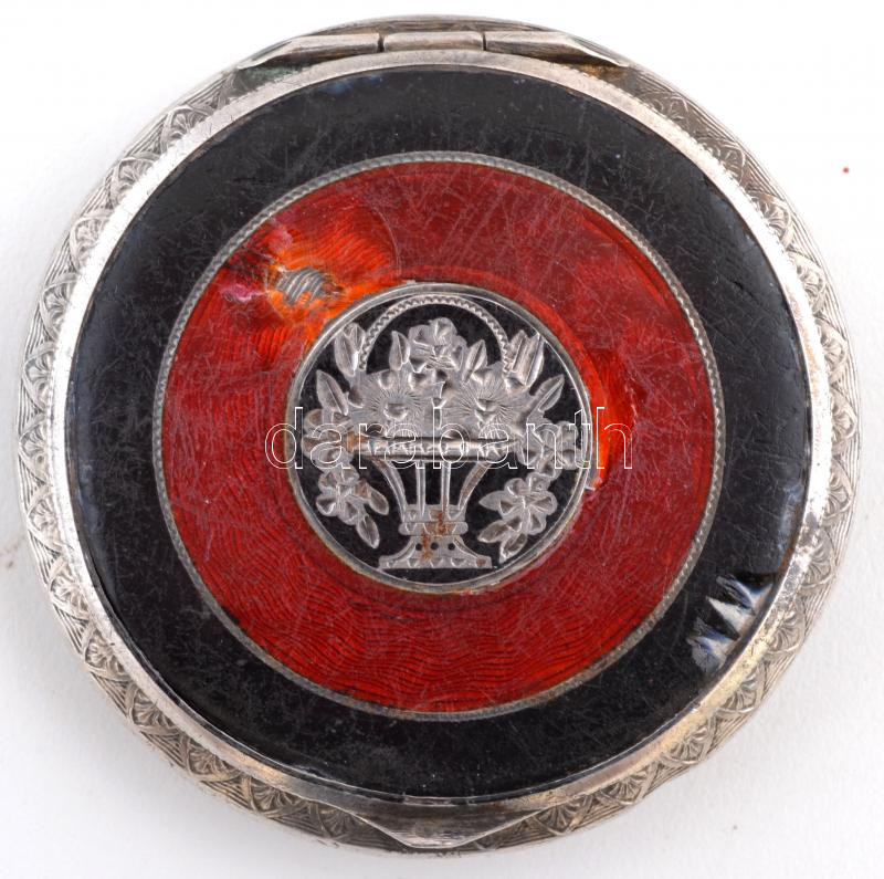 Ezüst tűzzománc szelence, Ag., br.: 34,2gr., jelzett, lepattanásokkal, d:5cm/ Silver casket with enamel, Ag, 34,2gr, marked, d: 5cm