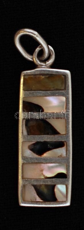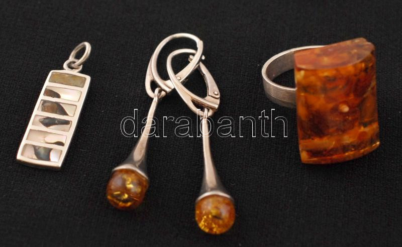 Ezüst(Ag) fülbevaló és gyűrű borostyán díszítéssel, ezüst(Ag) medál gyöngyház berakással, jelzettek, gyűrű mérete: 55, br: 12,7 g