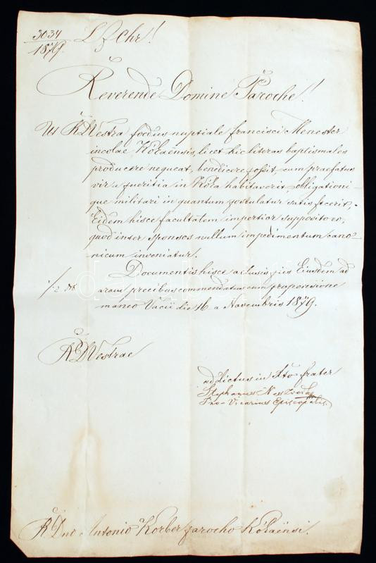 1879 A váci püspökség latin nyelvű levele a kókai plébániának honvéd házasodásának engedélyezése tárgyában