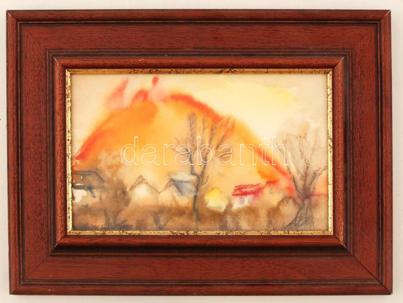 Antal Irén (1903-1999): A hegy lábánál, akvarell, papír, jelzett, üvegezett fa keretben, 14,5×23,5 cm
