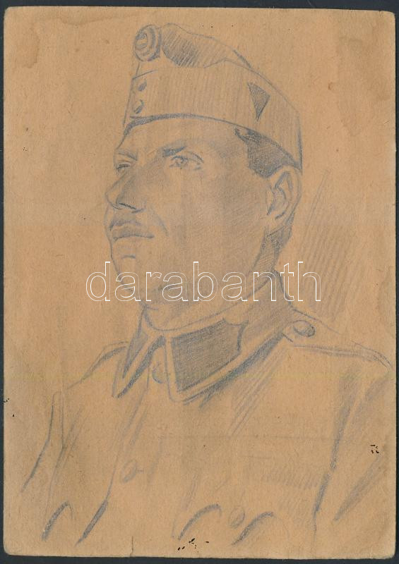 Jelzés nélkül: Katona. Ceruza, papír (tábori levelezőlap), foltos, 15×10 cm