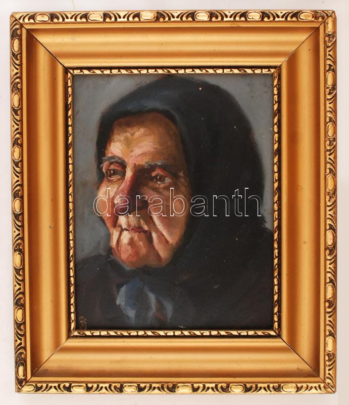 Jelzés nélkül: Öreganyó. Olaj, fa lemez, keretben, 27×22 cm