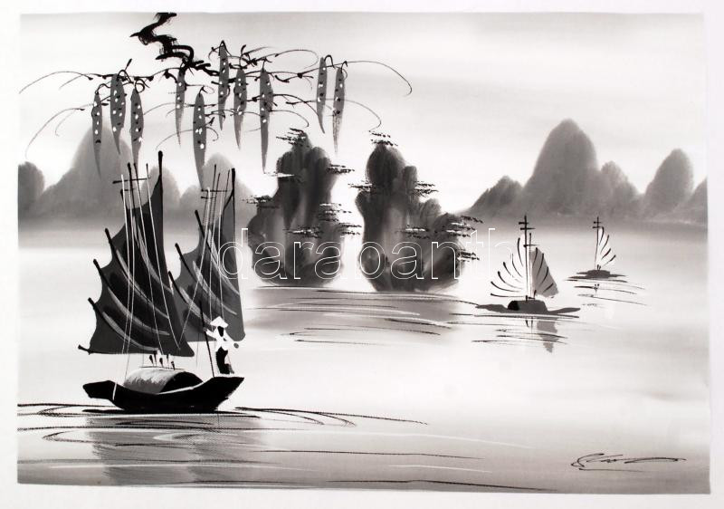 Olvashatatlan jelzéssel: Hajók sziklás vizeken, távol-keleti életkép, ...