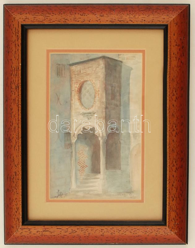 Petrik Albert (1876-1916): Kapu (vázlatrajz). Akvarell, papír, jelzett, üvegezett keretben, 19×12 cm
