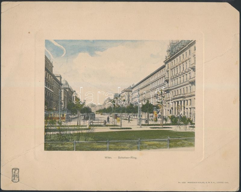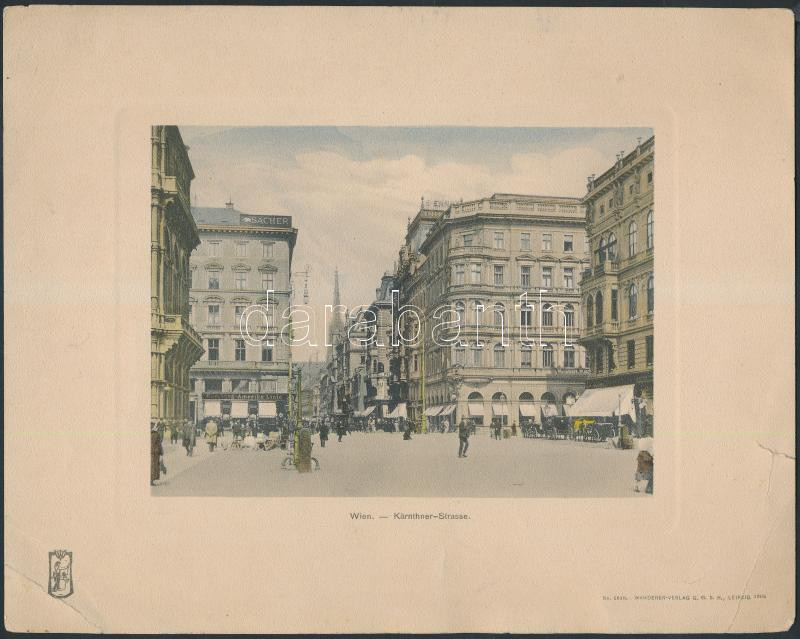 2 db nagyméretű fotó Bécsről (Pratergasse, Graben), az egyik kis szakadással, 20×26,5 cm + 1905 2 db Bécsről készült színes nyomtatvány (Schotten-Ring, Kärnthner-strasse), Wanderer Verlag Leipzig, gyűrődésekkel, kis hiánnyal, 19,5×24,5 cm
