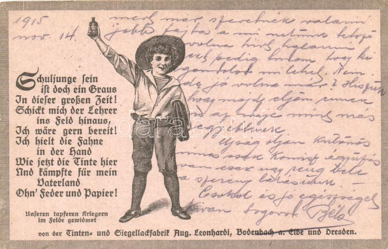 Tinten und Siegellackfabrik Aug. Leonhardi / German Inks and sealing wax factory advertisement, patriotic propaganda card (EK)