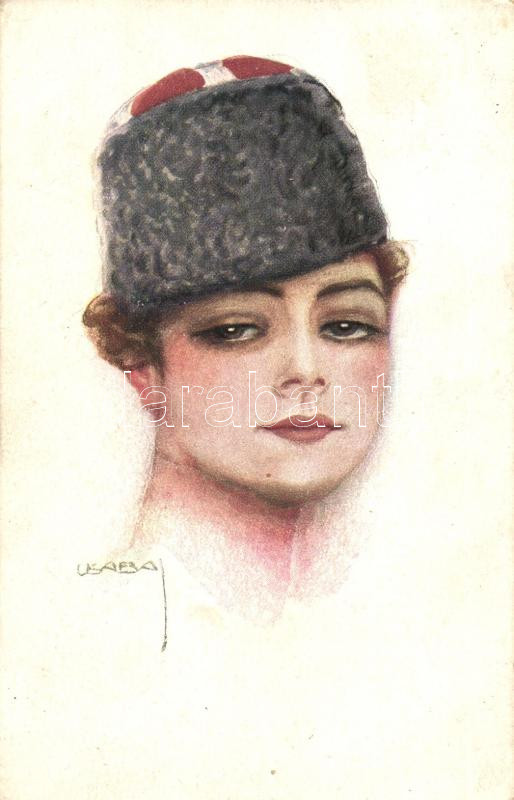 https://www.darabanth.com/en/253-Online-auction/253.0/Thematic-postcards/Artist~52/Italian-art-postcard-Lady-in-soldiers-hat-PFB-No-38924-s-Usabal~II1209646