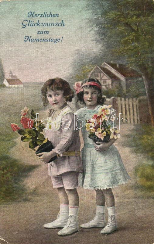 'Herzlichen Glückwunsch zum Namenstage!' / Nameday, children with flowers (EK)