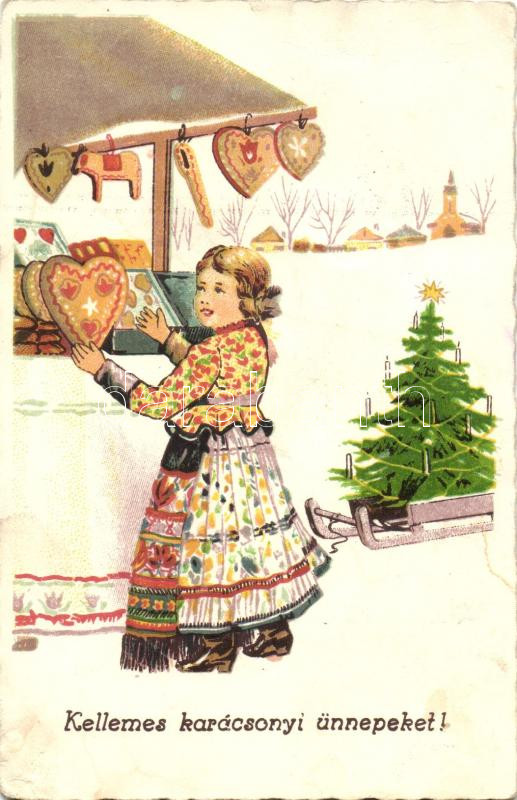 'Kellemes karácsonyi ünnepeket!' / christmas greeting card, gingerbread, girl in Hungarian traditional dress, folklore (fl)