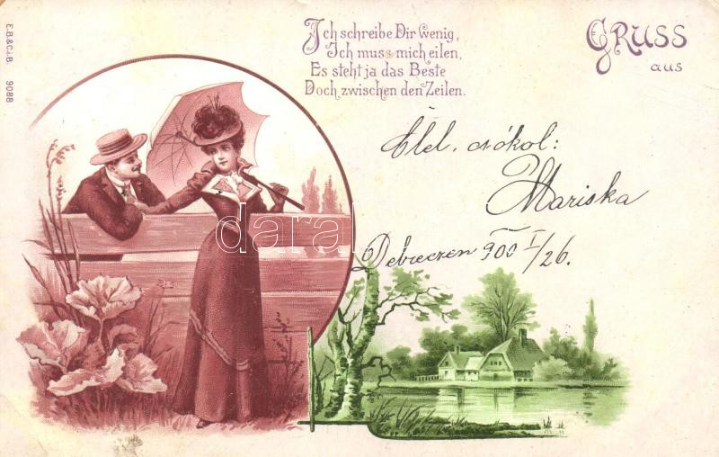 Romantic couple, greeting card, E.B. & C.i.B. 9088. floral, litho ...