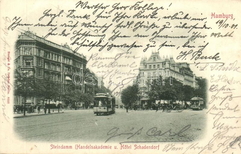 Hamburg, Steindamm, Handelsakademie, Hotel Schadendorf / street, academy, hotel, trams