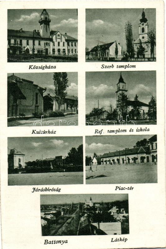 Battonya, Községháza, kultúrház, járásbíróság, szerb templom, református templom, piac tér (EK)