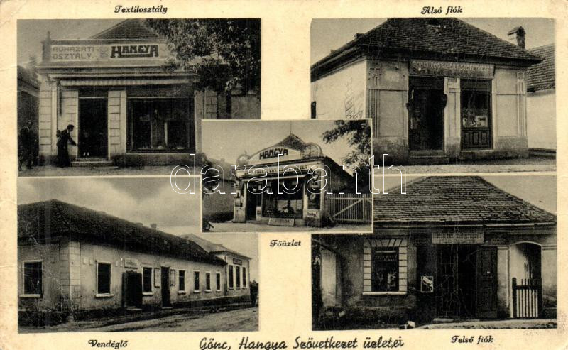 Gönc, Hangya szövetkezet üzletei; Textilosztály, Alsó és Felső fiók, Vendéglő, Főüzlet, kiadja Hangya (fa)