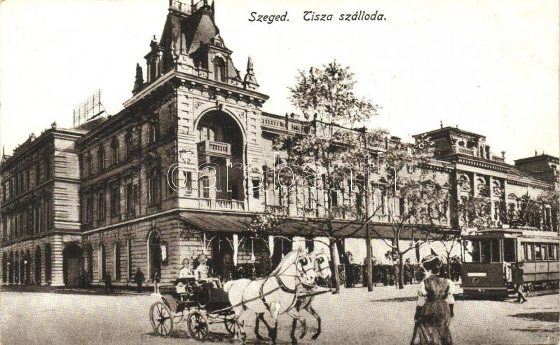 Szeged, Tisza szálloda, villamos, lovaskocsi (EK)