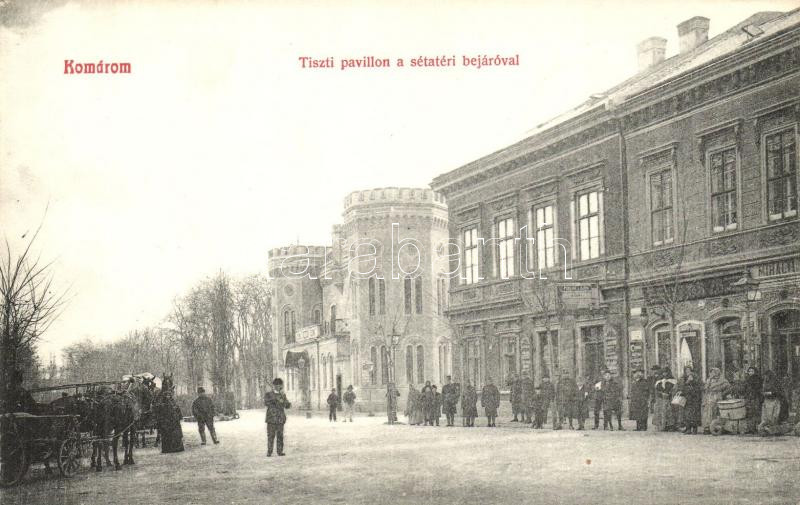 Komárom, Komárno; Tiszti pavilon a sétatéri bejáróval, Mihályi üzlete,...