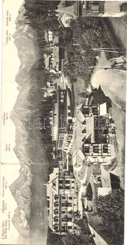 Ótátrafüred, Stary Smokovec; kávéház, étterem, Maurer Adolf üzlete, szálloda, Divald Károly / cafe, restaurant, shop, hotel, 3-tile panoramacard (hajtásnál elvált / bent till broken)
