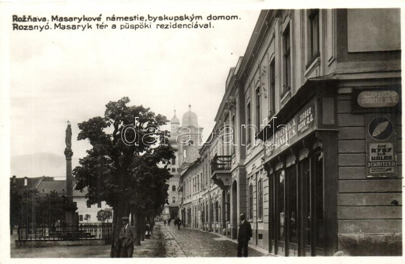 Rozsnyó, Rosnava; Masaryk tér a püspöki rezidenciával, Spisska Banka U...