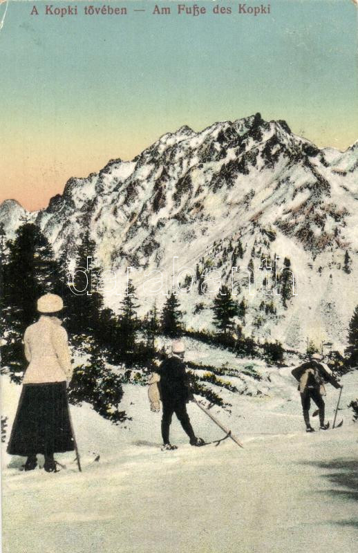 Tátra, Kopki tövében, síelők; Cattarino S. utóda Földes Samu kiadása, ...
