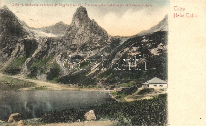 Tátra, Magas Tátra, Tatra; Zöld tó, Karbunkulus torony és a Frigyes menedékház / lake, mountain, rest house