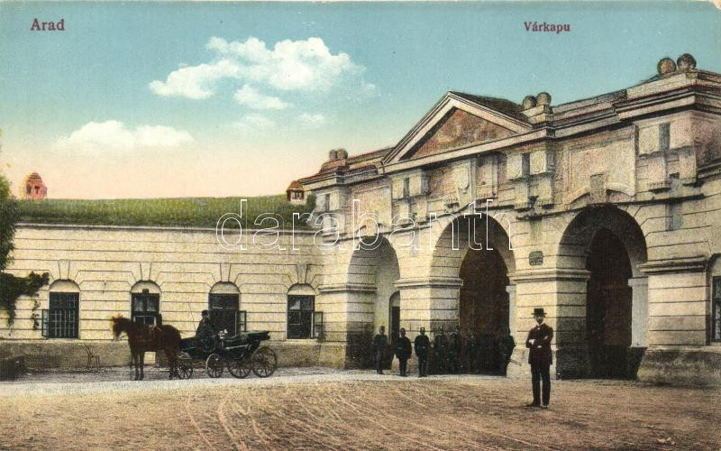 Arad; várkapu, lovaskocsi / castle gate, horse carriage