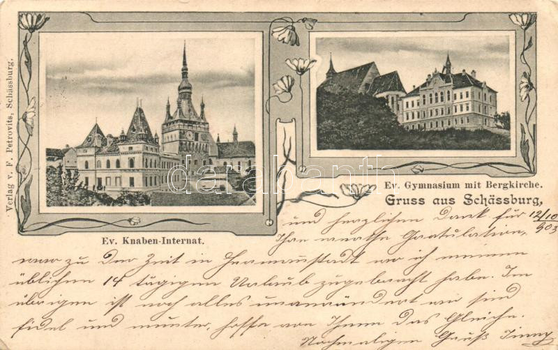 Segesvár, Schassburg, Sighisoara; Evangélikus fiú internátus és gimnázium, templom / boy school, grammar school, church, Art Nouveau (EK)