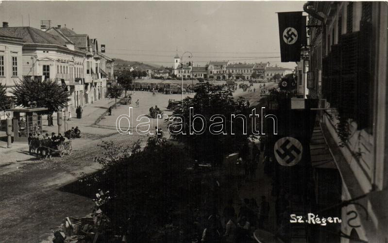 Szászrégen, Reghin; tér, katonai teherautók, a Harmadik Birodalom zászlói / square, military trucks, Third Reich flags, photo