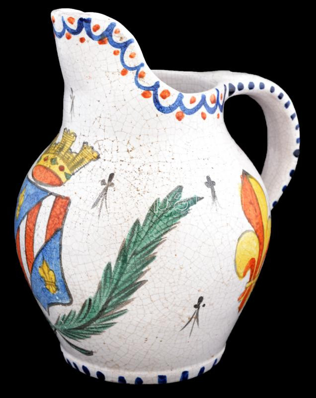 Antik, Anjou liliom címeres kerámia kancsó, kézzel festett, máz alatti...