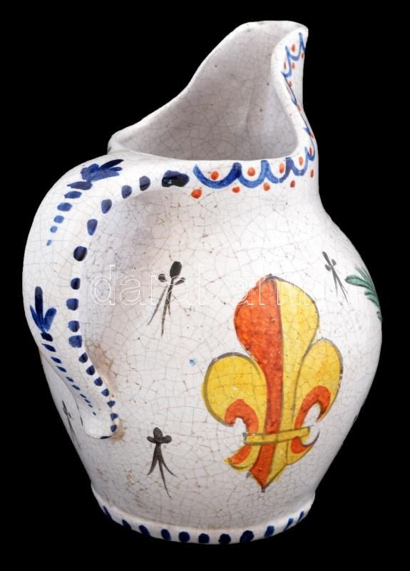Antik, Anjou liliom címeres kerámia kancsó, kézzel festett, máz alatti repedésekkel, 20x8cm