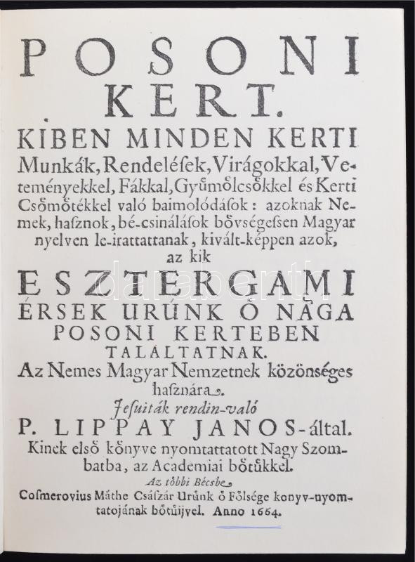 Description: Lippai János: Posoni kert. Helyben minden Kerti Munkák, Rendelések, Virágokkal, Veteményekkel, Fákkal, Gyömöltsökkel, és Kerti Csemetékkel való bajmolódások... Bp. 1965. Akadémiai. Az 1664-1667-ben megjelent 3 kötetes alapmű hasonmás kiadása egy kötetben. Aranyozott gerincű bordázott bőrkötésben. Szép példány. Az előzéklapon és az alsó lapszéleken bejegyzés tollal.