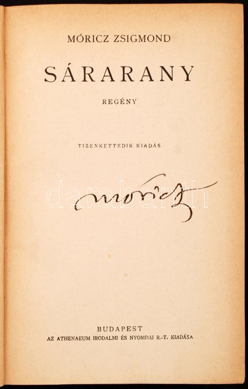 Móricz Zsigmond: Sárarany. 12. kiadás. Bp. é.n. Atheneum. 199 p. Aranyozott kiadói egészvászon-kötésben. Aláírt példány.