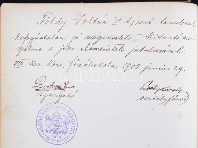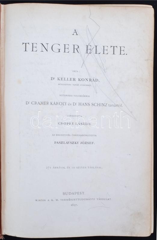 Keller Konrád: A tenger élete. Bp., 1897, Királyi Magyar Természettudományi Társulat. Berkes Imre, a Budapesti VIII. kerületi Főreáltanoda (ma: Vörösmarty Mihály Gimnázium) igazgatója (1903-1911), valamint az osztályfőnök, Patthy Károly (1855-1930) tanár, fordító, irodalomtörténész ajándékozó soraival és aláírásával 1908-ból, Földi Zoltán (1895-1987) későbbi vegyészmérnök, farmakológus részére. Megviselt, utólag ragasztott vászonkötésben, néhány lap kijár, ill. szakadással, egyébként jó állapotban.