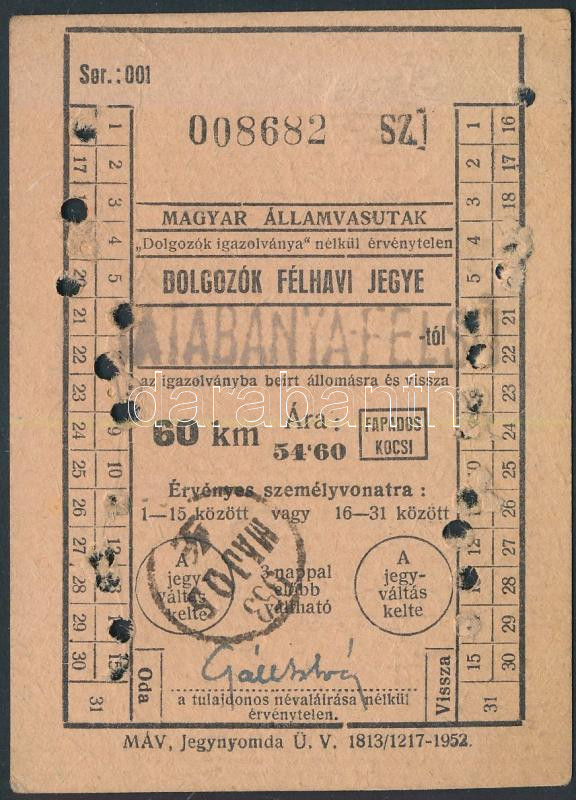 1953 Magyar Államvasutak által kiadott dolgozók félhavi jegye