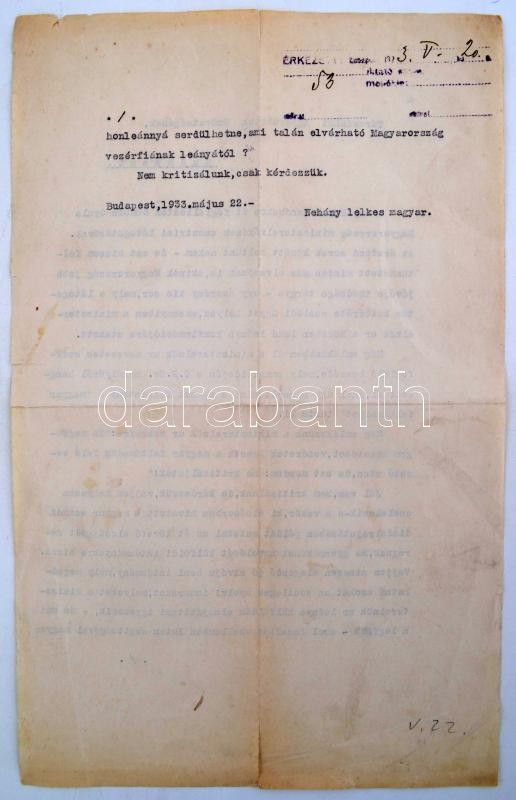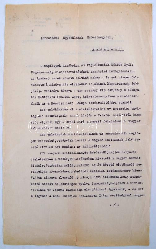 1933 Névtelen, kritizáló hangvételű gépelt levél a Társadalmi Egyesületek Szövetsége részére Gömbös Gyula lányának taníttatásával kapcsolatban