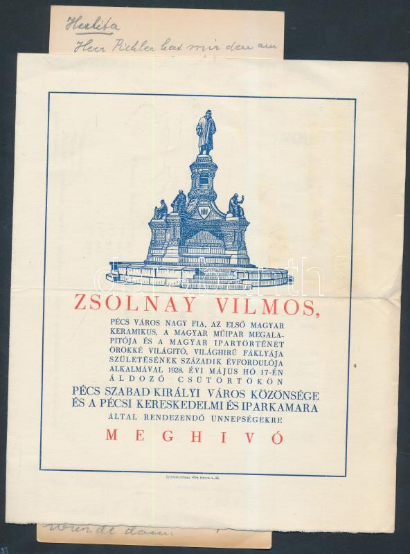 1928 Pécs, meghívó a Zsolnay Vilmos születésének századik évfordulója alkalmából rendezett ünnepségekre, mellékletekkel