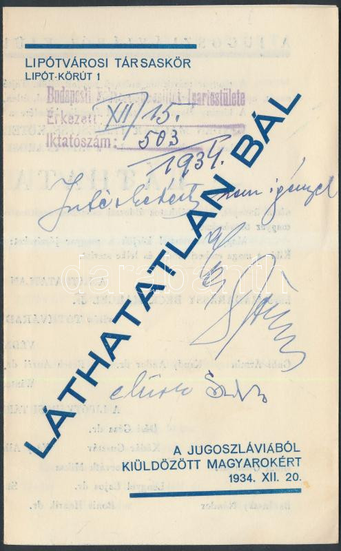1934 a Lipótvárosi Társaskör meghívója a Jugoszláviából kiüldözött mag...