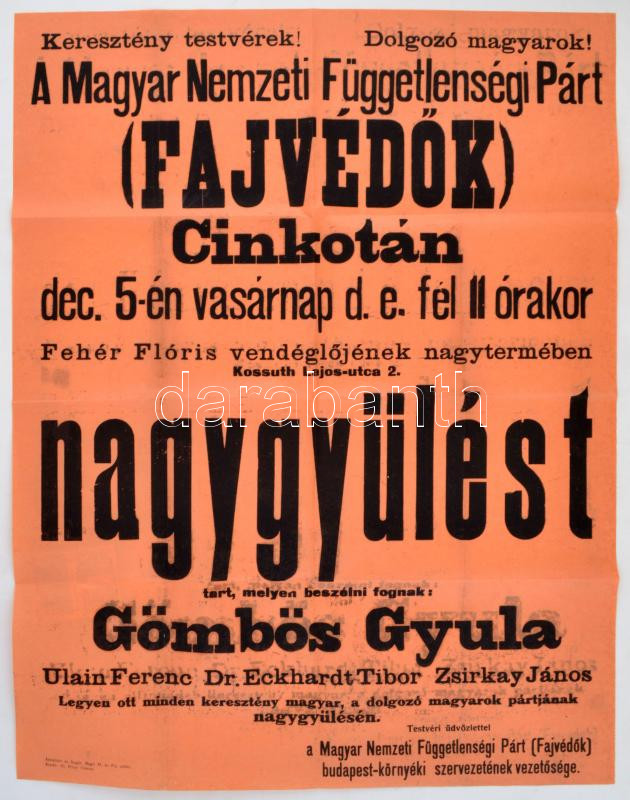 https://www.darabanth.com/en/254-Online-auction/254.0/Other-collectibles/Printed-Materials~400010/cca-1924-1928-Cinkota-Magyar-Nemzeti-Fuggetlensegi-PartFajvedok-nagygyuleset-hirdeto-nag~II1239086