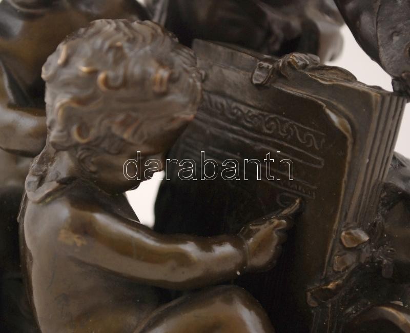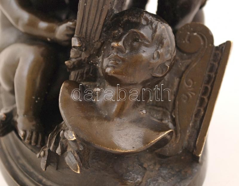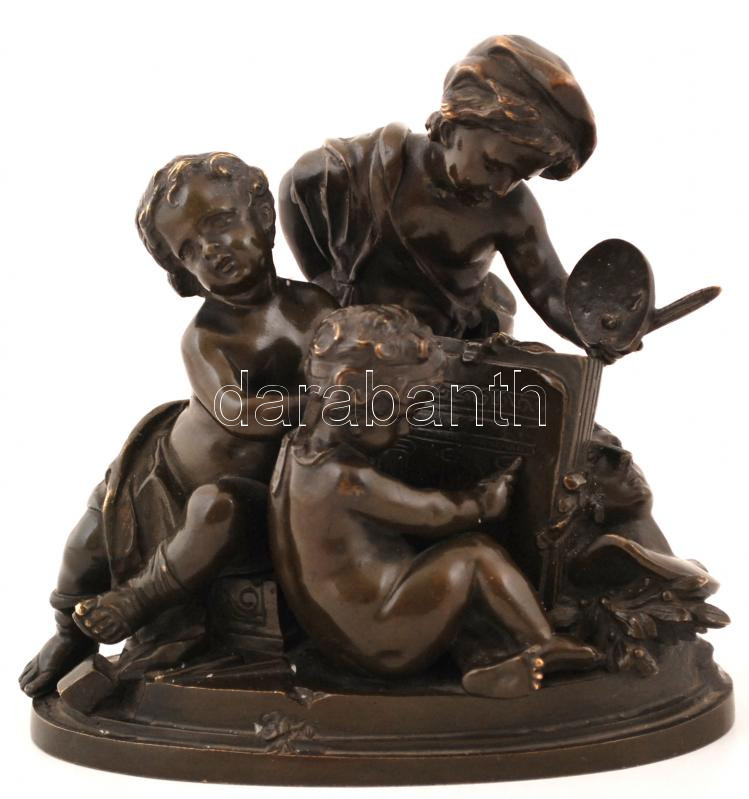 Description: Robert jelzéssel: Háromalakos bronz szobor. Építész, festő, szobrász, mögöttük ledőlt talpazat. / Bronze statue with figures of architecture, painting and sculptor 17 cm