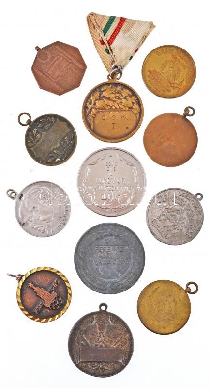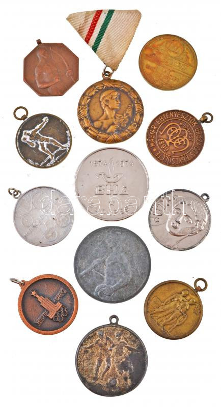 12db vegyes magyar és külföldi sportérem, emlékérem, közte 1975. "Hungexpo / Bulgár Nemzeti Kiállítás - Magyarország Felszabadulásának 30. évfordulója alkalmából" Br emlékérem (32mm), Berán Lajos (1882-1943) 1915. "1915.IV.20." Br díjérem "S.G.A." gyártói jelzéssel (30x30mm), Szovjetunió 1980. "Moszkva 1980" Br emlékérem (31mm) T:vegyes