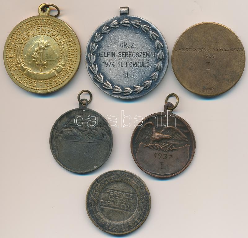 6db-os vegyes magyar sportérem tétel, közte Göröntsér Greff Lajos (1888-1976) 1939. "M.U.SZ. - Magyar Úszó Szövetség 1907 / 3x100m Ifj. váltó vegyes bajn. 1939. III." Br díjérem hátoldalán "LUDVIG BP" gyártói jelzéssel (34mm), 1974. "Orsz. Delfin-seregszemle 1974. II. forduló II." fém díjérem füllel (38mm) T:vegyes