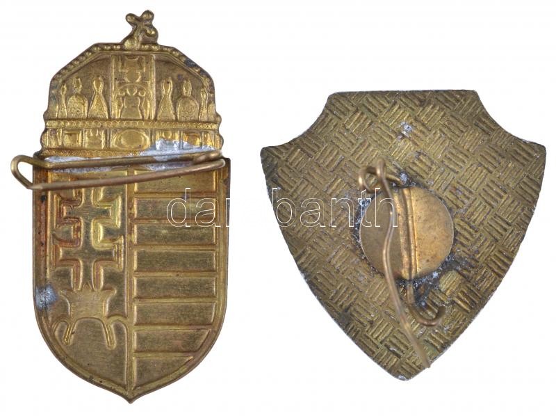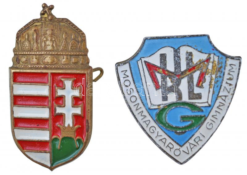 ~1970-1980. "Mosonmagyaróvári Gimnázium" festett fém jelvény (28x28mm) + Festett fém magyar címeres jelvény (38x23mm) T:2-,2
