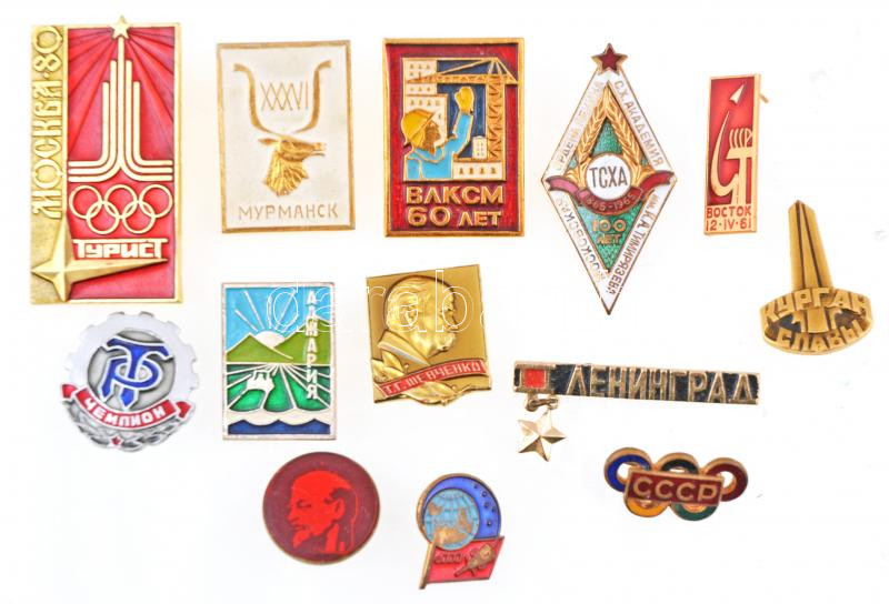 Szovjetunió 12db klf jelvény, legtöbb zománcozott, közte "Moszkvai Olimpia", "Leningrád", "Moszkvai Tyimirjazev Agrárakadémia 100. évfordulója" T:1-,2 Soviet Union 12pcs of diff badges, most of them enamelled, including "Moscow Olympics", Leningrad", "Moscow Timiryazev Agricultural Academy 100th Anniversary" C:AU,XF