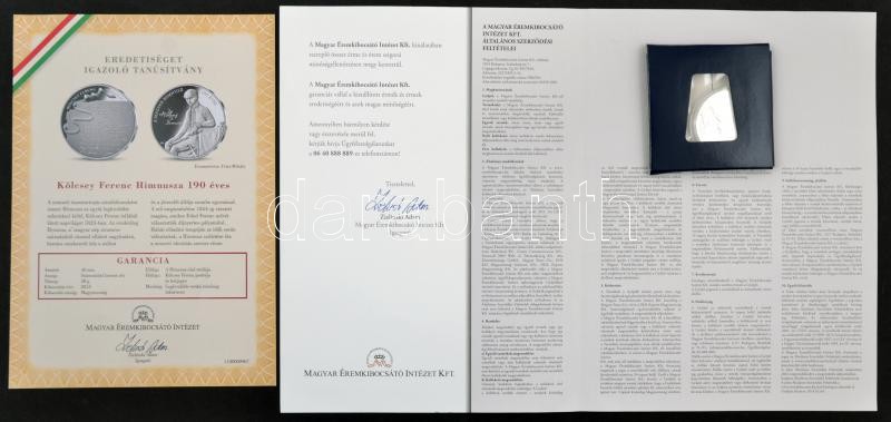 Fritz Mihály (1947-) 2013. "Kölcsey Ferenc Himnusza 190 éves" ezüstözött Cu emlékérem, tanúsítvánnyal, bontatlan kiadásban (28g/40mm) T:PP